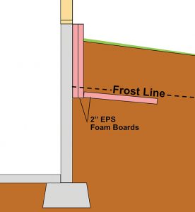 عایق بندی دیوارهای بیرونی حداقل تا خط یخبندان، اتاق انبار شما را در برابر دمای زیر صفر محافظت می کند و در عین حال امکان دسترسی به انرژی گرمایی از زمین های عمیق تر و یخ زده را فراهم می کند. یک بال افقی از عایق فوم برد به اندازه 2 تا 4 فوت در برابر نفوذ یخ عمیق تر محافظت می کند. توجه داشته باشید که بال فوم کمی دورتر از ساختمان قرار دارد تا زهکشی آب را تشویق کند.