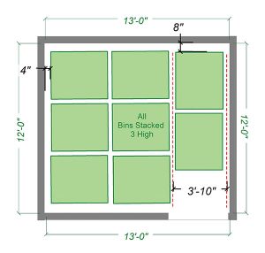 این اتاق ذخیره سازی با ابعاد 12 x 13 x 8 اینچ (1248 فوت مکعب) به طور محافظه کارانه 18000 پوند محصول را ذخیره می کند. در مجموع 24 سطل (جعبه سبز) هر کدام به ابعاد 48 اینچ X 40 اینچ X 30 اینچ (25 فوت مکعب) می توانند سه سطل را با 18 اینچ فضای اصلی روی هم قرار دهند. هشت اینچ بین دیوارهای انتهایی (یعنی دیوارها در راستای فن های خنک کننده) و سطل ها و چهار اینچ بین دیواره های جانبی و سطل ها وجود دارد تا جریان هوا را فراهم کند. یک مسیر حرکت کمی بیشتر از عرض سطل به سطلها اجازه میدهد تا به داخل و خارج از کولر روی جک پالت حرکت کنند.