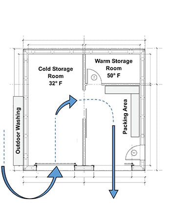 در حالت ایده آل، تأسیسات نگهداری سبزیجات زمستانی در نزدیکی مناطق شستشو در فضای باز قرار دارند و به یک فضای گرم برای شستشو و بسته بندی متصل می شوند. تسهیلات باید برای گردش کار کارآمد طراحی شوند، از جمله دسترسی آسان از میدان و دسترسی آسان به ویترین فروشگاه ها یا مناطق بارگیری برای وسایل نقلیه تحویل. تمامی تصاویر توسط نویسنده